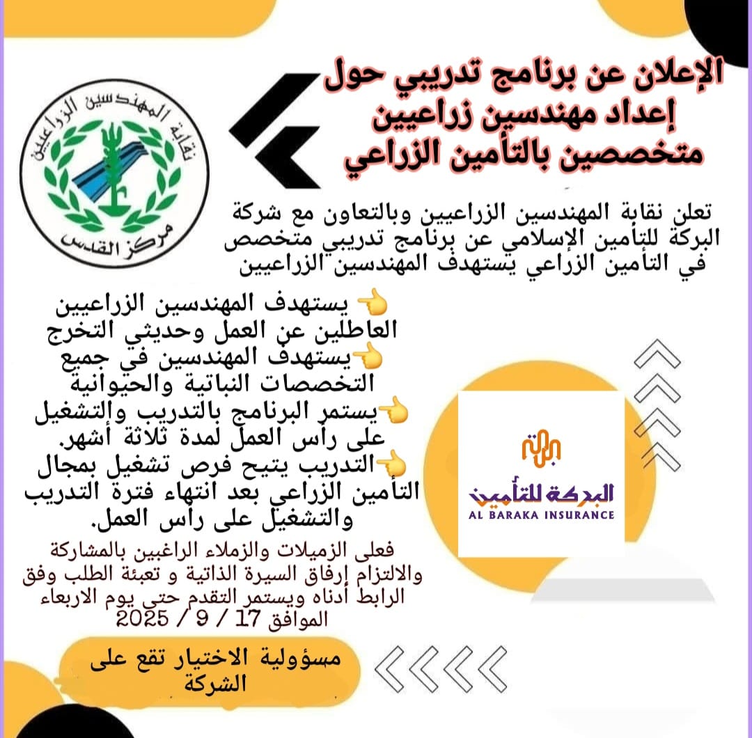 تعلن نقابة المهندسين الزراعيين وبالتعاون مع شركة البركة للتأمين الإسلامي عن برنامج تدريبي متخصص في التأمين الزراعي يستهدف المهندسين الزراعيين العاطلين عن العمل وحديثي التخرج في جميع التخصصات النباتية والحيوانية، حيث يستمر البرنامج بالتدريب والتشغيل على رأس العمل لمدة ثلاثة أشهر.