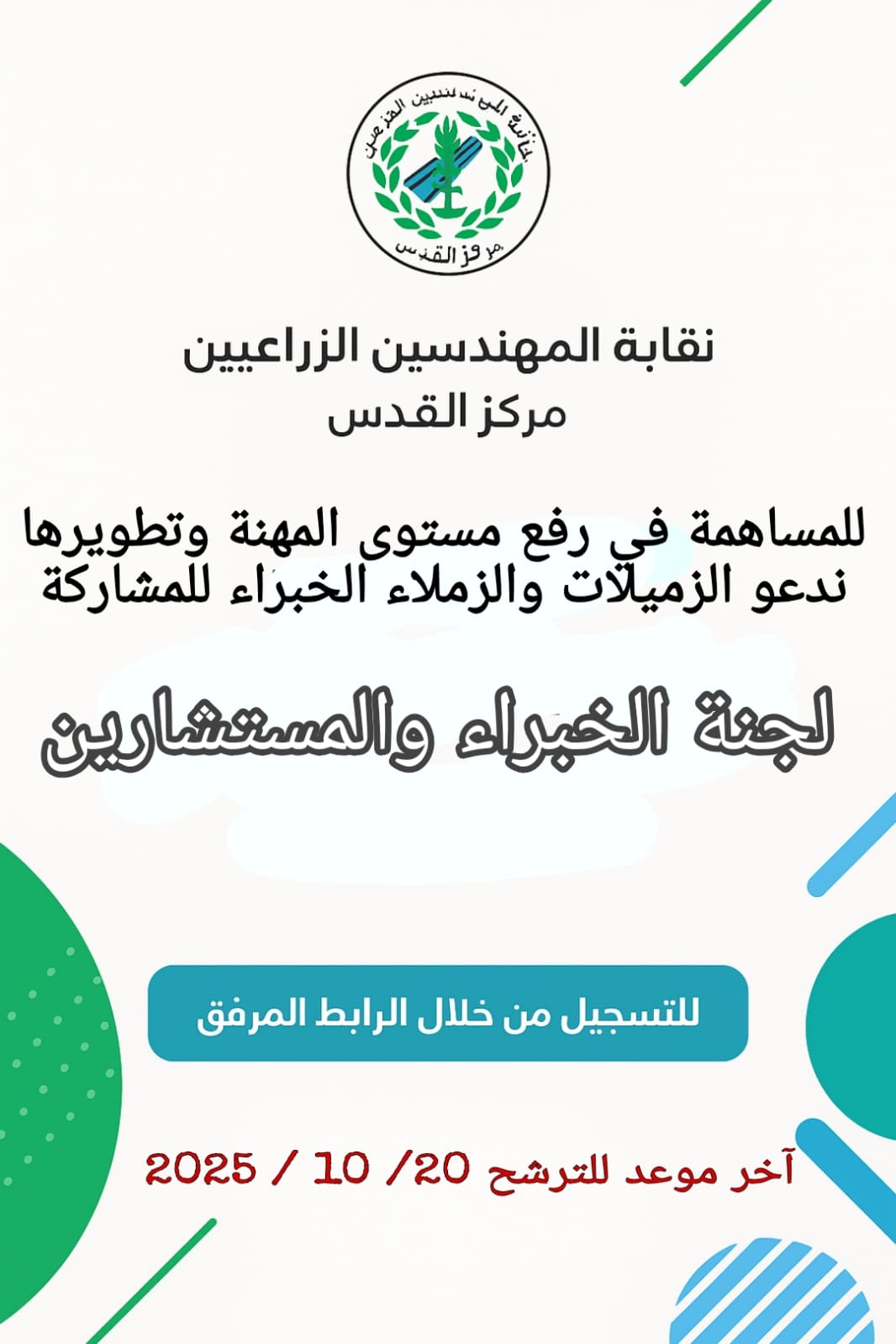 بناءا على مبادرة من معالي وزير الزراعة البروفسور رزق سليمية والتي دعى لها يوم تكريم المهندسين الزراعيين وافتتاح قاعة النقابة على شرف يوم المهندس الزراعي العربي، وضمن قانون النقابة تعلن نقابة المهندسين الزراعيين عن دعوة الزميلات والزملاء ذوي الخبرة الراغبين بالتسجيل في لجنة الخبراء والمستشارين ضمن الشروط التالية :